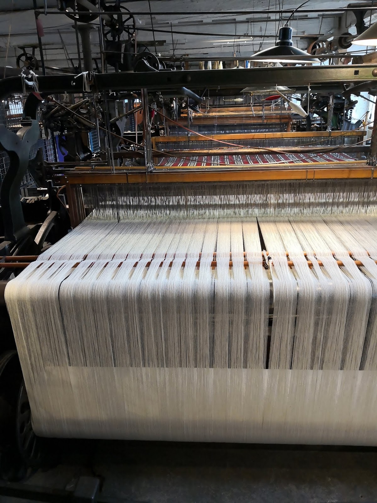 Hier entsteht nun das eigentliche Tuch. Im Webraum steht eine Webmaschine neben der anderen. Eine davon hat man für uns Besucher angestellt. Die Schussmaschine einer einzigen Webmaschine macht schon so viel Lärm dass man sich schwer tut sich vorzustellen, wie die Arbeiter den Krach den ganzen Tag lang ausgehalten haben - bei mehreren Maschinen die gleichzeitig laufen.
