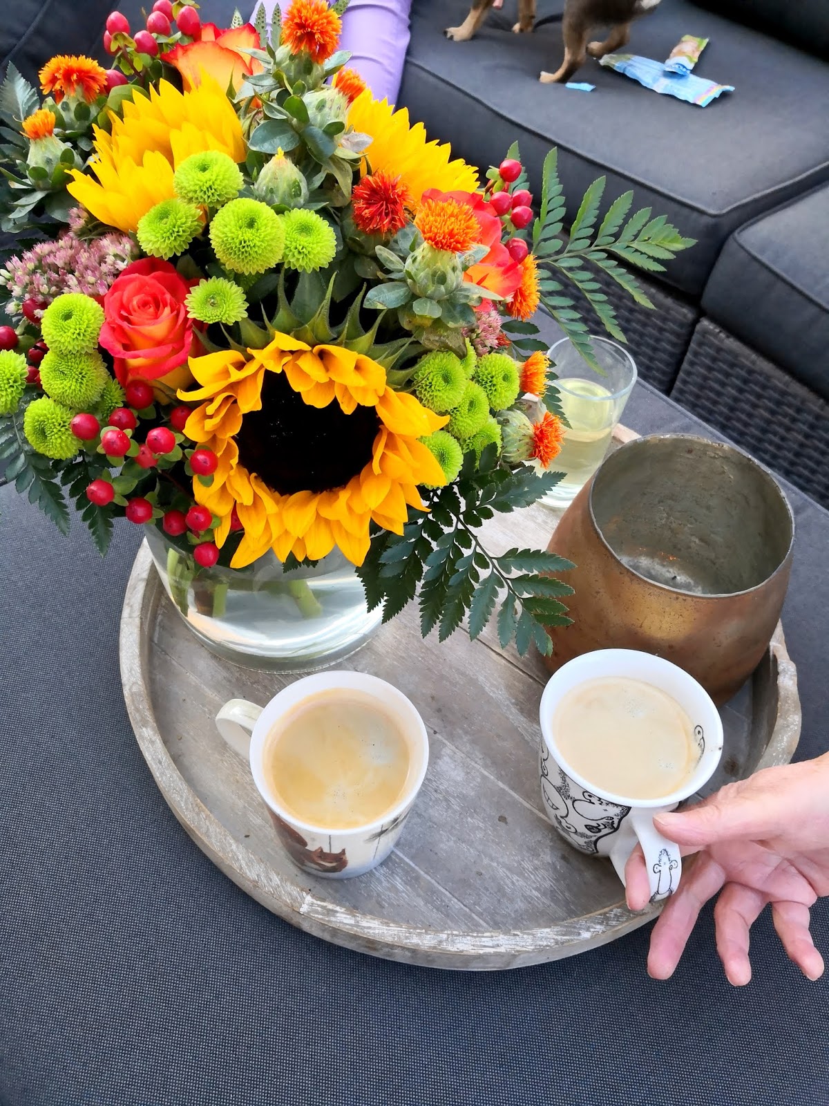Saturday morning my mom came over for a visit. We sat outside in the sun and had coffee. My mom brought this beautiful bunch of flowers and slowly but surely I come to think this year is my year of flowers. I never got so many bunches of flowers before and on saturday there was not even an occasion for it she just brought it like that.